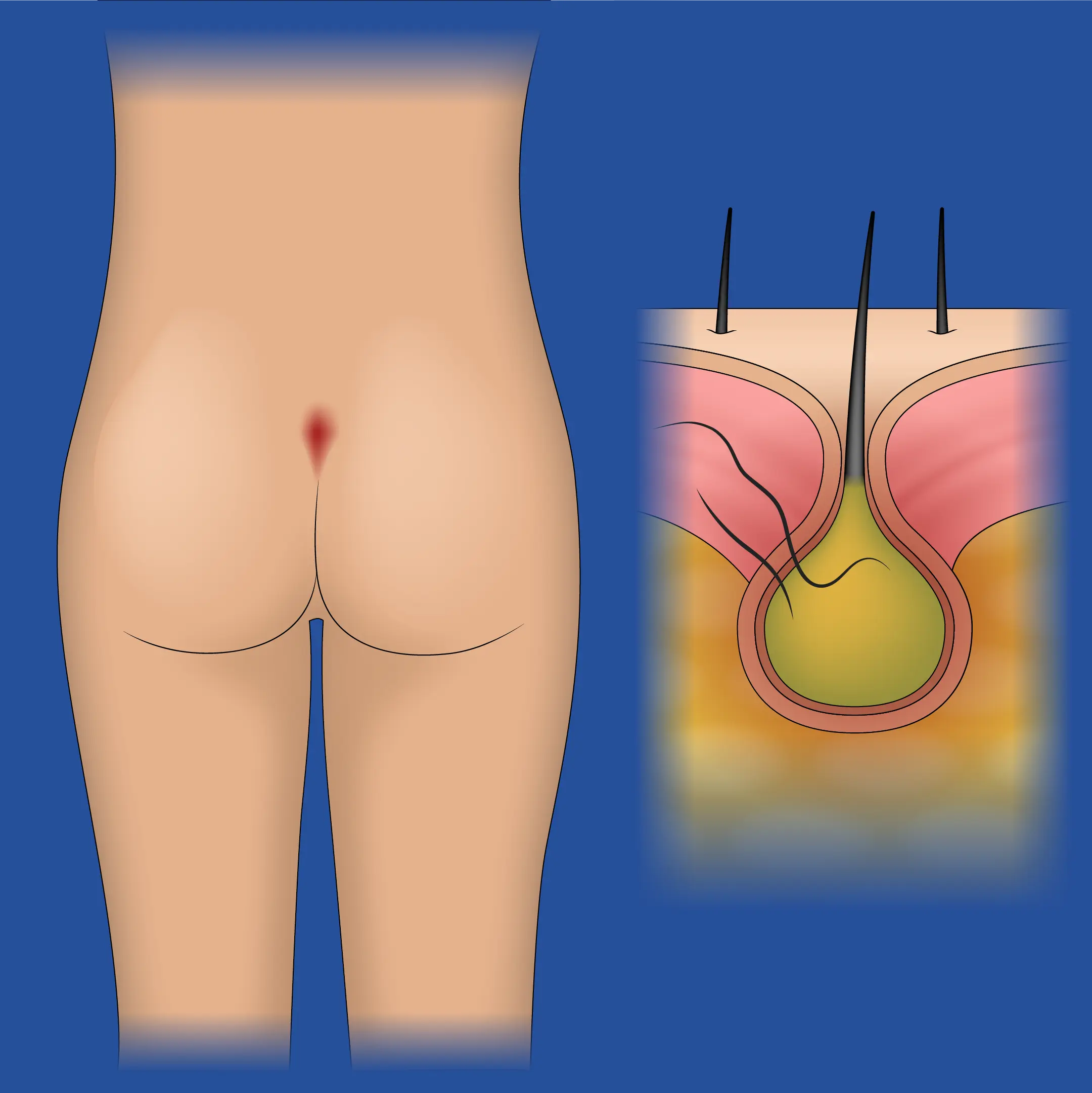 This condition is typically caused by ingrown or broken hairs that become inflamed and develop into painful fistulas. Young and heavily hirsute men are particularly affected. Surgical removal using the gentle "Pit-Picking" method offers rapid, scar-free healing.